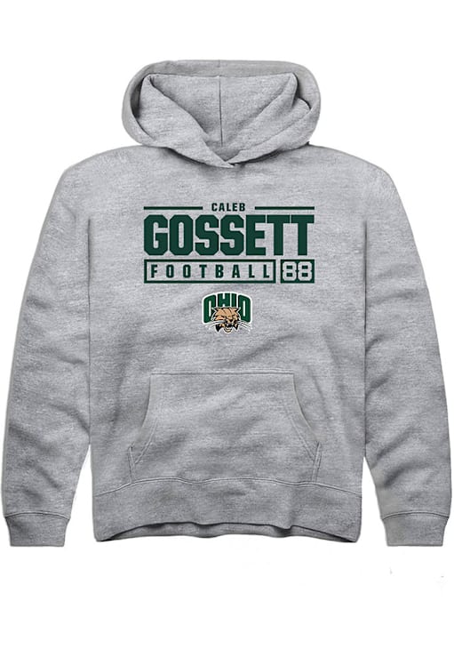 Caleb Gossett Rally Youth Grey Ohio Bobcats NIL Stacked Box Long Sleeve Hooded Sweatshirt
