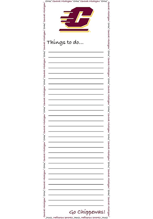 Product Details Product Details Team colors and logoTeam slogan in lower cornerFaded team logo in center50 sheets per padPerfect gift for any occasion! Officially Licensed Show your Chippewas spirit at the office with this Central Michigan Chippewas To Do Notepad. This Notepad features a team logo and colors.