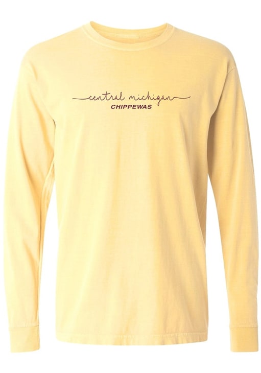 Show your Central Michigan Chippewas spirit in this CMU Chippewas Yellow T-Shirt! This CMU Chippewas Addie Tee Long Sleeve T-Shirt makes a great layer for cooler nights cheering on the Chippewas. Featuring a screen print team name on center chest, this Central Michigan Chippewas Long Sleeve LS Tee is an essential addition for every fan. Hail Chippewa!