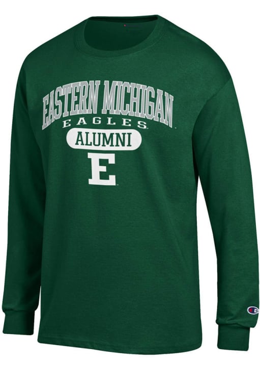 Show your Eastern Michigan Eagles spirit in this Eastern Michigan Green T Shirt! This Eastern Michigan Pill Box Alumni Jersey Long Sleeve T Shirt makes a great layer for cooler nights cheering on the Eagles. Featuring a printed team graphic on front chest, this Eastern Michigan Eagles Long Sleeve Tee is an essential addition for every fan. Go Eagles!