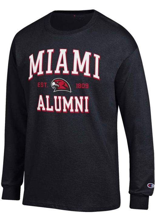 Show your Miami RedHawks spirit in this Miami of Ohio Black T Shirt! This Miami of Ohio Est Alumni Jersey Long Sleeve T Shirt makes a great layer for cooler nights cheering on the Redhawks. Featuring a printed team graphic on front chest, this Miami RedHawks Long Sleeve Tee is an essential addition for every fan. Go RedHawks!