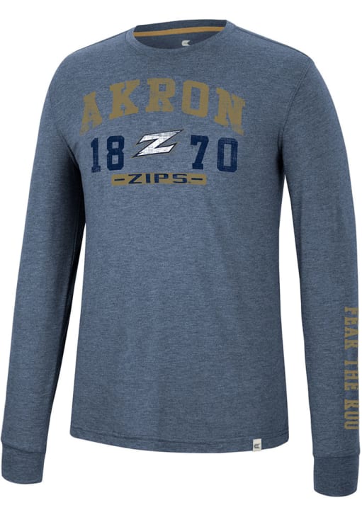 Make a bold statement in this Akron Zips Navy Blue Zen Philosopher Long Sleeve Fashion T Shirt! This Akron Zips Long Sleeve Fashion Tee features a distressed screen print team graphic on front chest. Go Zips!