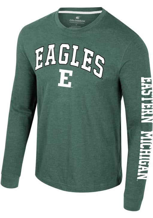Show your Eastern Michigan Eagles spirit in this Eastern Michigan Green T Shirt! This Eastern Michigan Reese Long Sleeve T Shirt makes a great layer for cooler nights cheering on the Eagles. Featuring a rubberized print of arched team name over mascot on front chest with team slogan on left sleeve, this Eastern Michigan Eagles Long Sleeve Tee is an essential addition for every fan. Go Eagles!