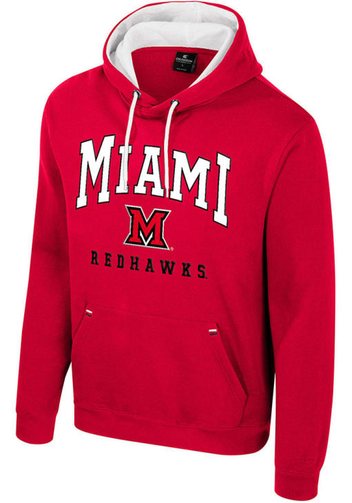 Embrace your Redhawks pride and showcase your team spirit with confidence in this Miami RedHawks Long Sleeve Hoodie! Stay warm and stylish with the Miami of Ohio Mens Red Zion Hooded Sweatshirt. Designed with team graphic twill applique on front chest, this Redhawks Long Sleeve Hoodie is a must-have for dedicated fans.