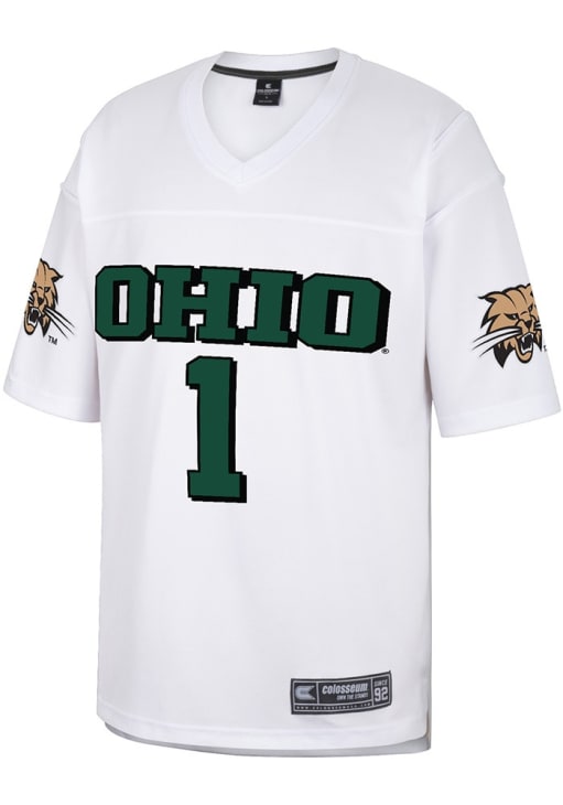 Get in the game with this ultimate Ohio Bobcats Mens White No 1 Football Jersey. Wear this Jersey to the upcoming tailgate or game for your Bobcats. With a screen printed team name and number on the front, team mascot name and number on the back, with team logo on sleeves, this Mens Football Jersey is a great way to show your team spirit in style.