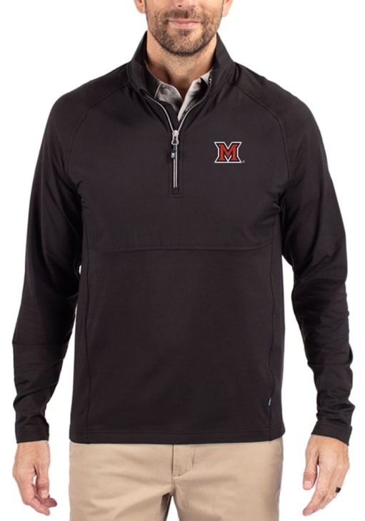 Embrace the warmth and showcase your Redhawks pride with our Miami RedHawks Long Sleeve Qtr Zip Pullover. This Mens Black Adapt Eco Hybrid Long Sleeve Pullover offers a wind resistant recycled shell for the perfect combination of comfort and style. Elevate your everyday look with this must-have Miami RedHawks Long Sleeve Qtr Zip Pullover.