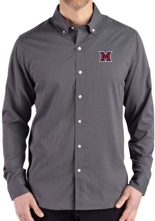 Mens Miami RedHawks Black Cutter and Buck Gingham LS Woven Long Sleeve Dress Shirt