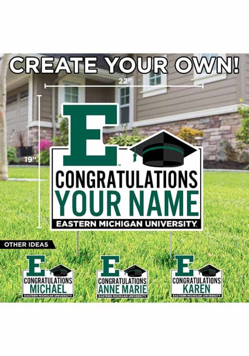 Product Details Product Details First Name ONLY.Approximatley 19"x22"Cut to Shape Weatherproof PlasticMetal Stakes IncludedFull Color PrintCustomized Graduation Sign with your name! Officially Licensed Eastern Michigan Eagles Custom Grad Yard Sign will let everyone know you root for the Eagles proudly. This Yard Sign features a weather resistant material.