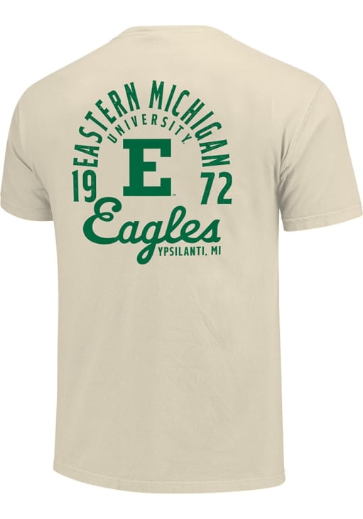 Display your team spirit with this remarkable Eastern Michigan Eagles Ivory Mascot Overlay Short Sleeve T Shirt! The Eastern Michigan Short Sleeve Tee showcases a Screen Printed Design that truly sets it apart. Stand out from the crowd and proudly declare your allegiance to the Eagles with this exceptional Ivory Eastern Michigan T Shirt. Go Eagles!