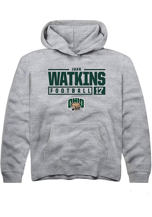 Juan Watkins Rally Youth Grey Ohio Bobcats NIL Stacked Box Long Sleeve Hooded Sweatshirt