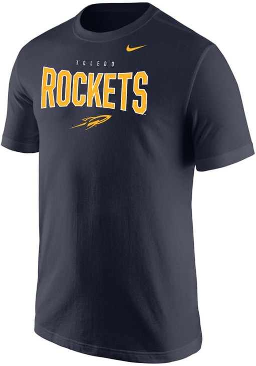 Display your team spirit with this remarkable Toledo Rockets Navy Blue Bowtie over mascot Short Sleeve T Shirt! The Toledo Short Sleeve Tee showcases a screenrpint team logo across front chest that truly sets it apart. Stand out from the crowd and proudly declare your allegiance to the Rockets with this exceptional Navy Blue Toledo T Shirt. Go Rockets!