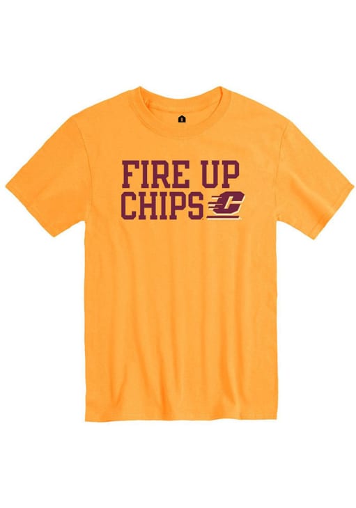 Display your team spirit with this remarkable Central Michigan Chippewas Rally Gold Slogan Short Sleeve T Shirt! The CMU Chippewas Short Sleeve Tee showcases a screen print of "Fire Up Chips" across chest with primary C logo that truly sets it apart. Stand out from the crowd and proudly declare your allegiance to the Chippewas with this exceptional Gold CMU Chippewas T Shirt. Hail Chippewa!