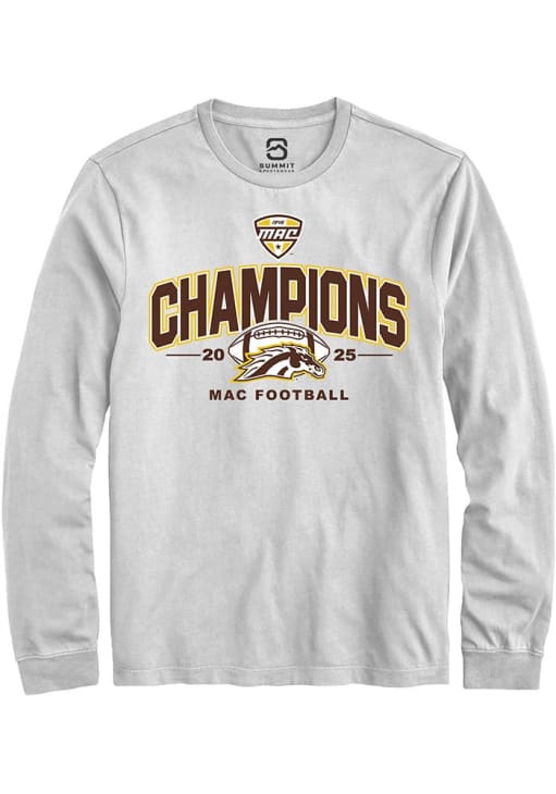 Show your Western Michigan Broncos spirit in this WMU Broncos White T Shirt! This WMU Broncos MAC 2025 Football Champions Long Sleeve T Shirt makes a great layer for cooler nights cheering on the Broncos. Featuring a championship team logo, this Western Michigan Broncos Long Sleeve Tee is an essential addition for every fan. Go Broncos!