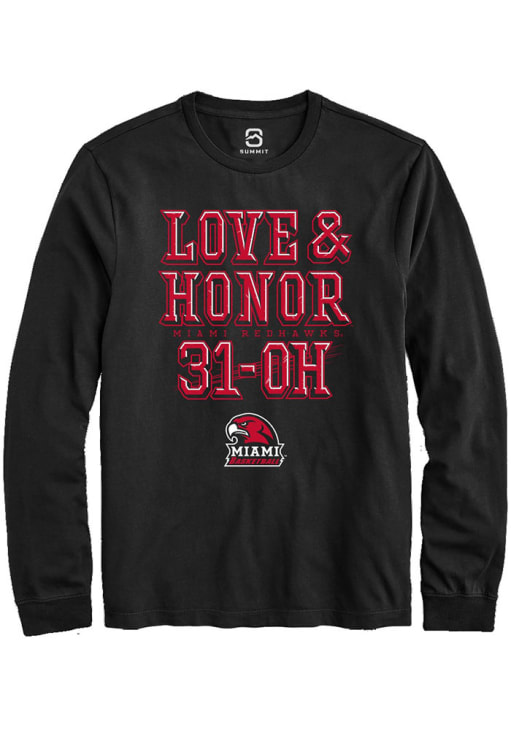 Show your Miami RedHawks spirit in this Miami of Ohio Black T Shirt! This Miami of Ohio Love & Honor 31-OH Long Sleeve T Shirt makes a great layer for cooler nights cheering on the Redhawks. Featuring a championship team logo, this Miami RedHawks Long Sleeve Tee is an essential addition for every fan. Go RedHawks!