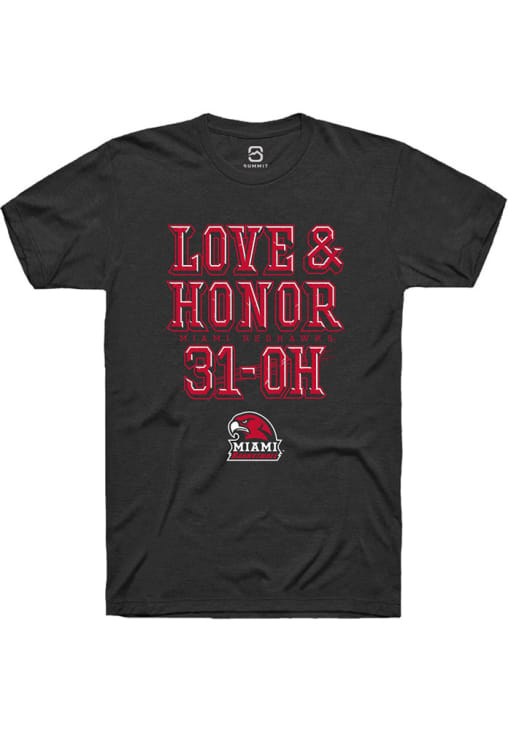Display your team spirit with this remarkable Miami RedHawks Summit Sportswear Black Love & Honor 31-OH Short Sleeve T Shirt! The Miami of Ohio Short Sleeve Tee showcases a championship team logo that truly sets it apart. Stand out from the crowd and proudly declare your allegiance to the Redhawks with this exceptional Black Miami of Ohio T Shirt. Go RedHawks!