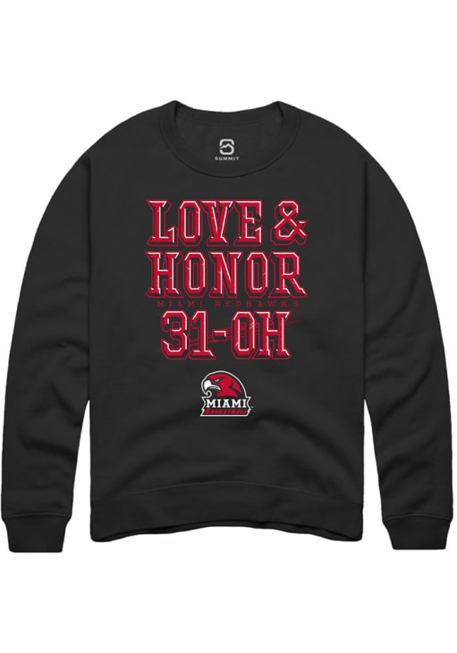 Gear up for the ultimate game day experience with this remarkable Miami RedHawksMens Black Love & Honor 31-OH Crew Sweatshirt! Designed with the true fan in mind, this Redhawks Long Sleeve Crew Sweatshirt features a championship team logo. Stay warm and comfortable with this Mens Miami of Ohio Redhawks Crew Sweatshirt.