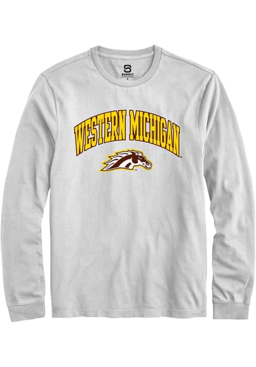 Show your Western Michigan Broncos spirit in this WMU Broncos White T Shirt! This WMU Broncos Arch Logo Long Sleeve T Shirt makes a great layer for cooler nights cheering on the Broncos. Featuring a digitally printed graphic, this Western Michigan Broncos Long Sleeve Tee is an essential addition for every fan. Go Broncos!