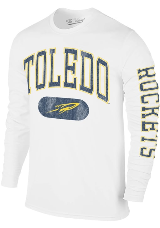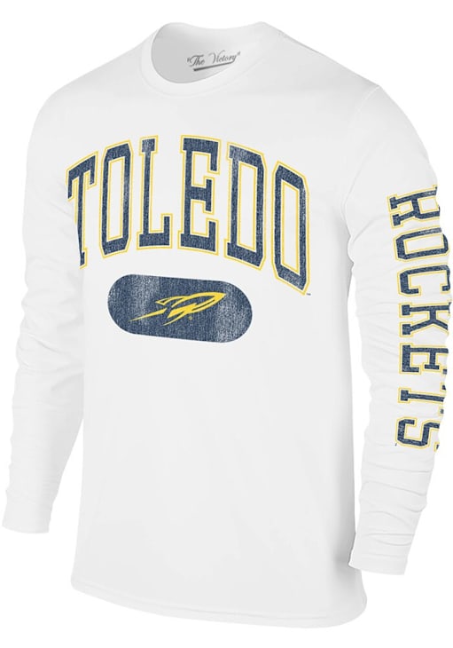 Show your Toledo Rockets spirit in this Toledo White T Shirt! This Toledo Distressed Pill Long Sleeve T Shirt makes a great layer for cooler nights cheering on the Rockets. Featuring a screen printed team graphic on front chest, this Toledo Rockets Long Sleeve Tee is an essential addition for every fan. Go Rockets!