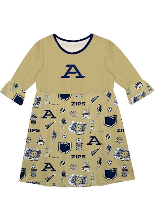 Support for your favorite team in this Toddler Gold Akron Zips Impressions Long Sleeve Dress! This Dress features a hand sketched artwork perfect to keep the new fan cheering for your favorite team, so everyone will know your favorite team is the Akron Zips! This is the perfect Akron Zips Toddler Dress for wearing to game day or everyday. Go Zips!