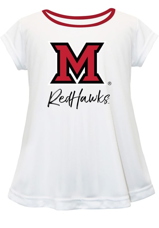 Support your favorite team in this Girls White Miami RedHawks Script Blouse Short Sleeve T-Shirt! This T-Shirt features a contrast piping on neck and team logo and script mascot name on chest, so everyone will know your favorite team is the Miami of Ohio! This is the perfect Miami RedHawks Girls T-Shirt for wearing to game day or everyday. Go RedHawks!