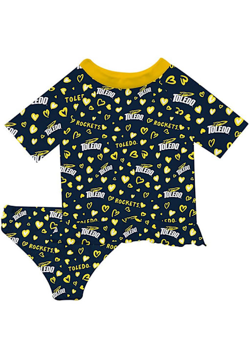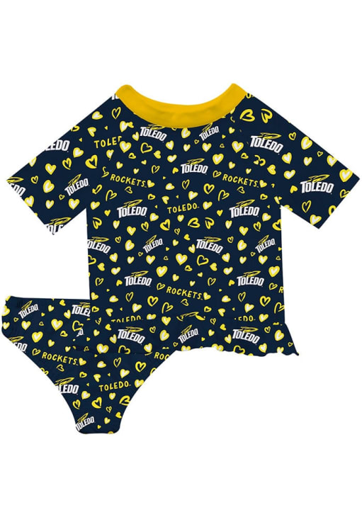 Support your favorite team in this Infant Girls Blue Toledo Rockets Rash Guard Short Sleeve T-Shirt! This T-Shirt features a repeat hearts and logo pattern, so everyone will know your favorite team is the Toledo! This is the perfect Toledo Rockets Infant Girls T-Shirt for wearing to game day or everyday. Go Rockets!