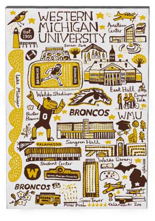 Showcase your WMU Broncos Broncos spirit on your fridge at work or at home with this Western Michigan Broncos Julia Gash Jumbo Magnet. This Magnet features a hand drawn illustrations of campus landmarks by Julia Gash.
