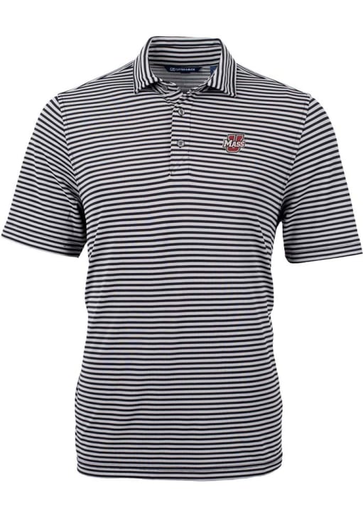 Mens Massachusetts Minutemen Black Cutter and Buck Virtue Eco Pique Stripe Short Sleeve Polo Shirt
